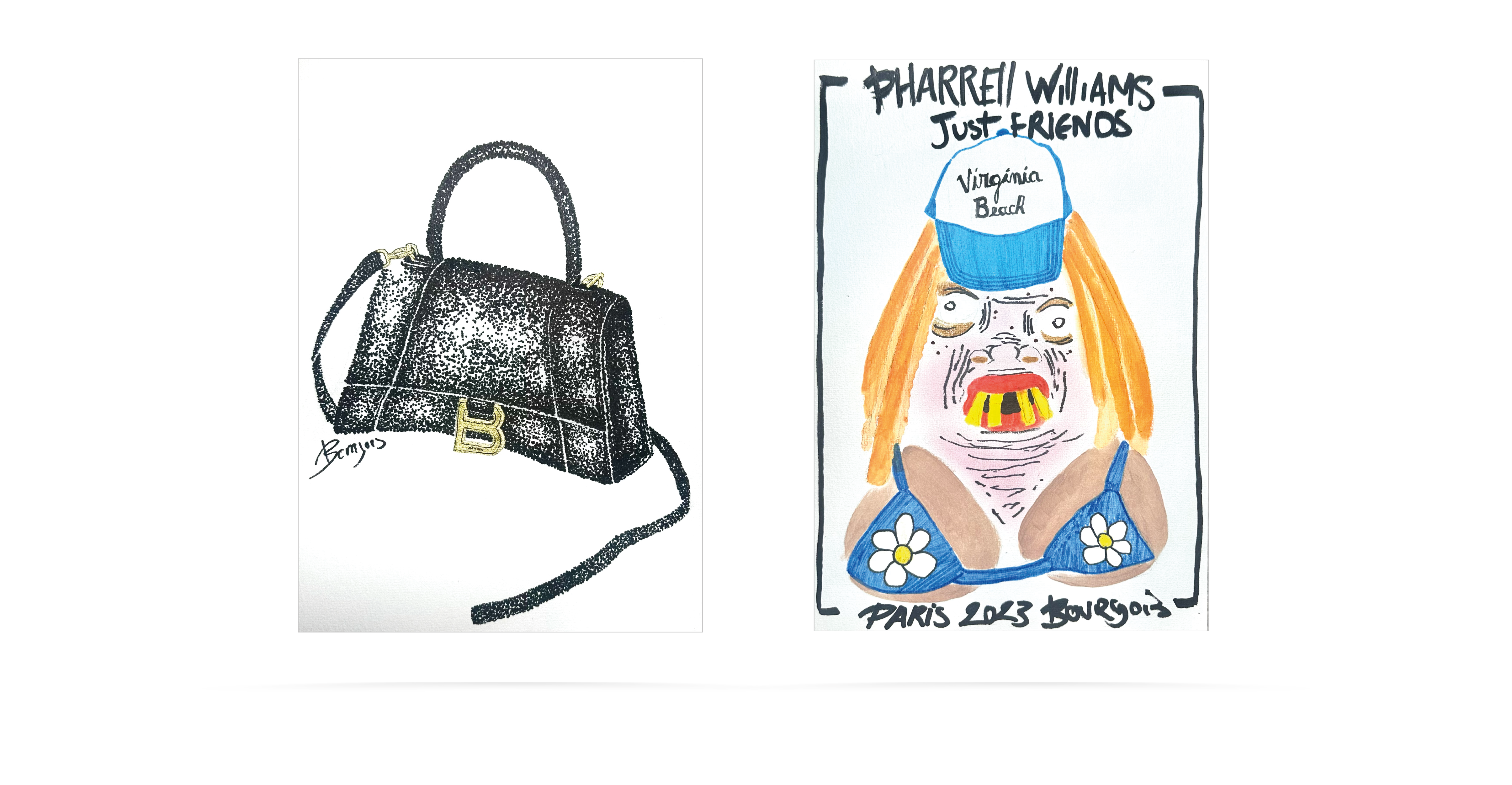 Réalisés sur papier 250 g au format A3 paysage, ils combinent feutre, crayon, stylo, ombrages, Stabilo, peinture et autres techniques pour capturer les détails de la collection.